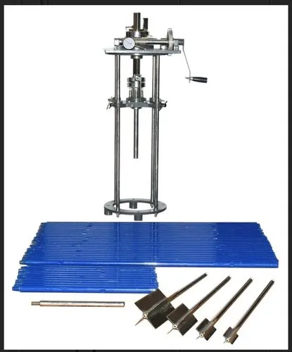 Consists of a torque head adjustable in height by means of a lead screw rotated by a drive wheel to enable the vane to be lowered into the specimen. Rotation of the vane is by means of a hand wheel which operates a worm gear arrangement turning the upper end of a calibration torsion spring, vane dia, rod dia, vane size & vane height are as per IS specifications. The vane shaft is attached through the hollow upper shaft to a resettable pointer, which indicates the angle indicates the angle of torque on a dial graduated in degree the dial reading multiplied by spring factor gives the torque a container for soil sample is also supplied & a sampling tube of 38mm. i.d. & 150mm long can also be used as container . Supplied with set of four springs, one each of approx. 2 kgs/cm sq., 4kgs/cm sq., 6 kgs/cm sq. & 8kgs/cm sq. complete as above in a wooden carrying case
